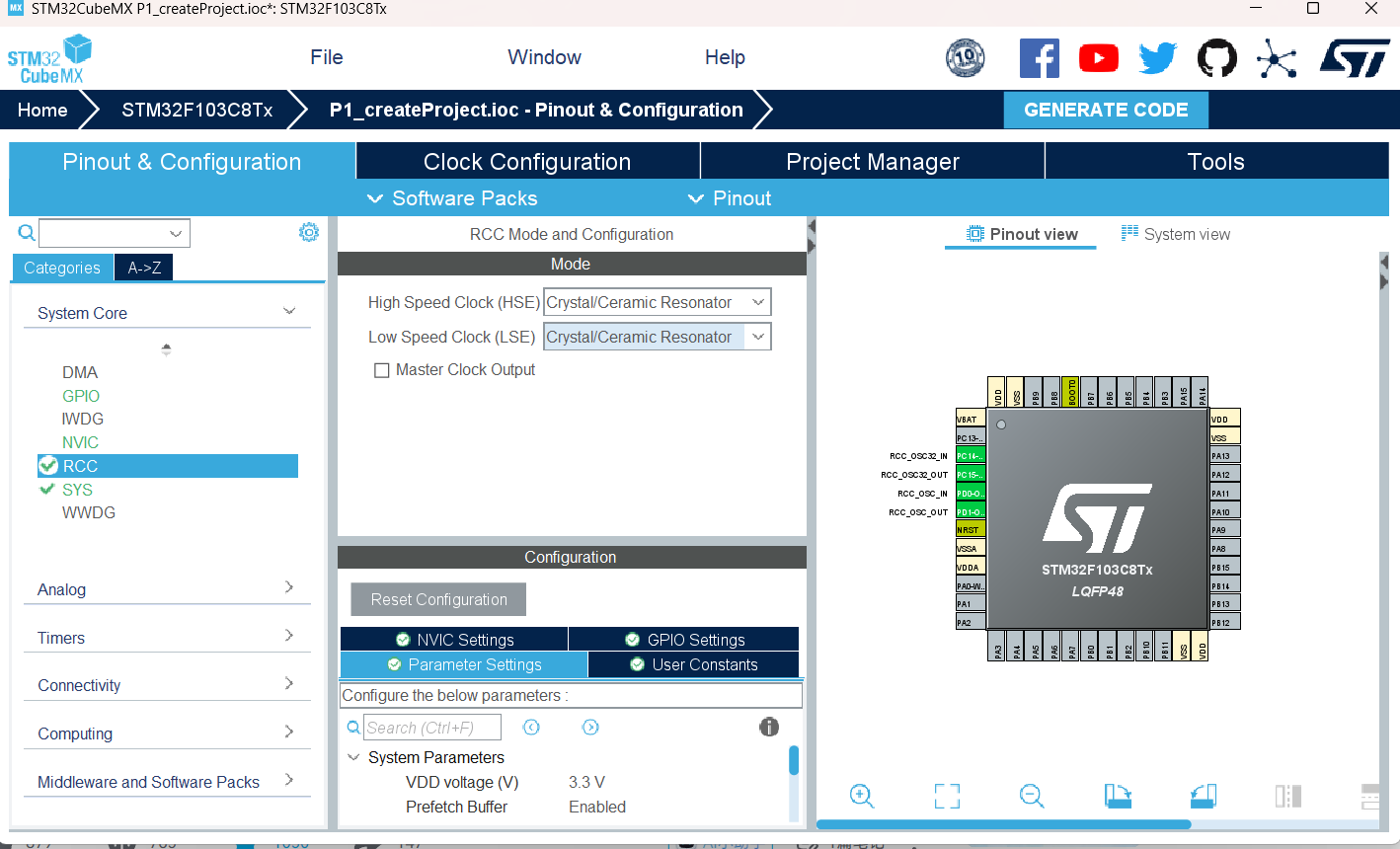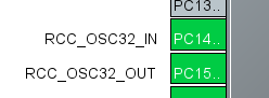 这次我们配置低速时钟信号,也设置为外部晶振控制,选择完之后发现PC14和PC15这两个引脚会变成绿色,也就是说f103c8t6这款芯片,高速时钟是通过PD0和PD1进行输入的,低速信号是通过PC14和PC15进行输入的