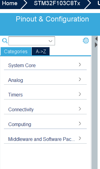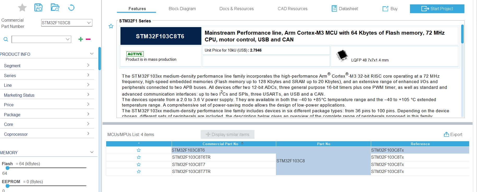 左上角搜索STM32F103C8,然后选择STM32F103C8T6这个内核,然后点击右上角的star project