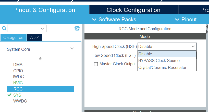 我们先点击system,然后点击rcc,发现有两个选项,high是高速时钟,low是低速时钟,我们选高速时钟中的第三个选项,第三个选项的意思是我们选择外部晶振信号