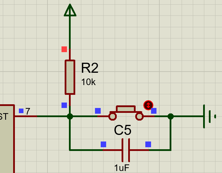 接下来我们搭建复位电路,需要10kΩ的电阻,105的电容和一个开关。