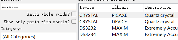 搜索我们的晶振名字CRY STAL,点击第一个,然后点击确定,我们把它摆出来