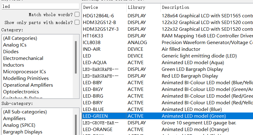 然后我们在器件库搜索LED,然后下拉,找到GREEN,放置一个。