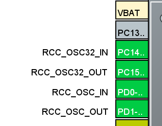选择完之后发现PD0和PD1这两个引脚会变成绿色,也就是说f103c8t6这款芯片,外部时钟信号的引脚,只能通过PD0和PD1两个引脚接入