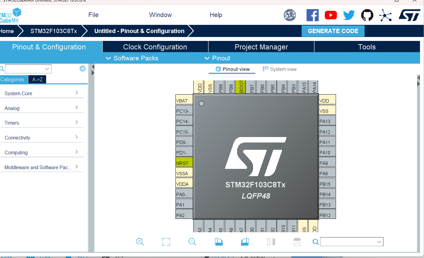 这里就模拟了我们真实的一个芯片和他的引脚分布,然后再左边我们进行系统设置