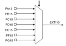 每个GPIO引脚都可连接至EXTI:但不是一对一的关系。它是分组的,例如: