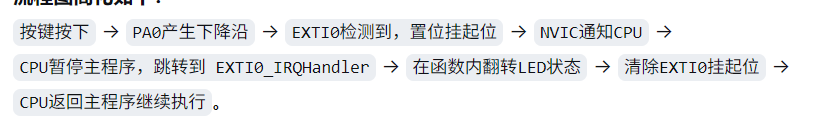 你可以把它想象成单片机的一个“哨兵系统”。这个哨兵系统部署在芯片的各个GPIO引脚上。正常情况下,CPU(中央处理器)在“专心致志”地执行主程序。当某个被设置为EXTI的引脚上发生了指定的“敌情”(如电平从高变低)时,哨兵(EXTI)会立刻向CPU报告,CPU就会暂停当前正在执行的任务,转而去处理这个“紧急事件”(执行一个叫做中断服务函数 的特殊程序),处理完毕后,再回到原来的任务继续执行。