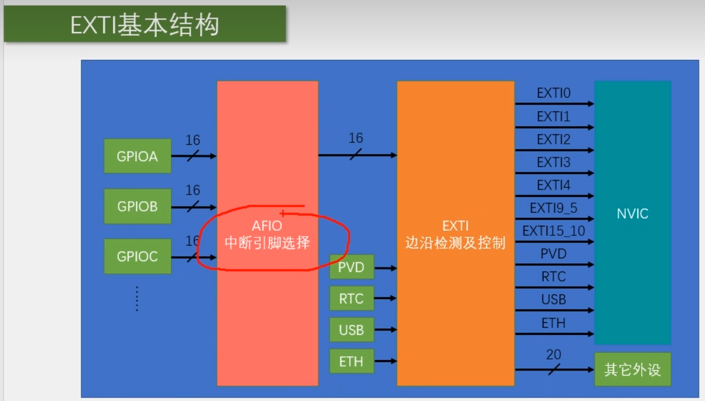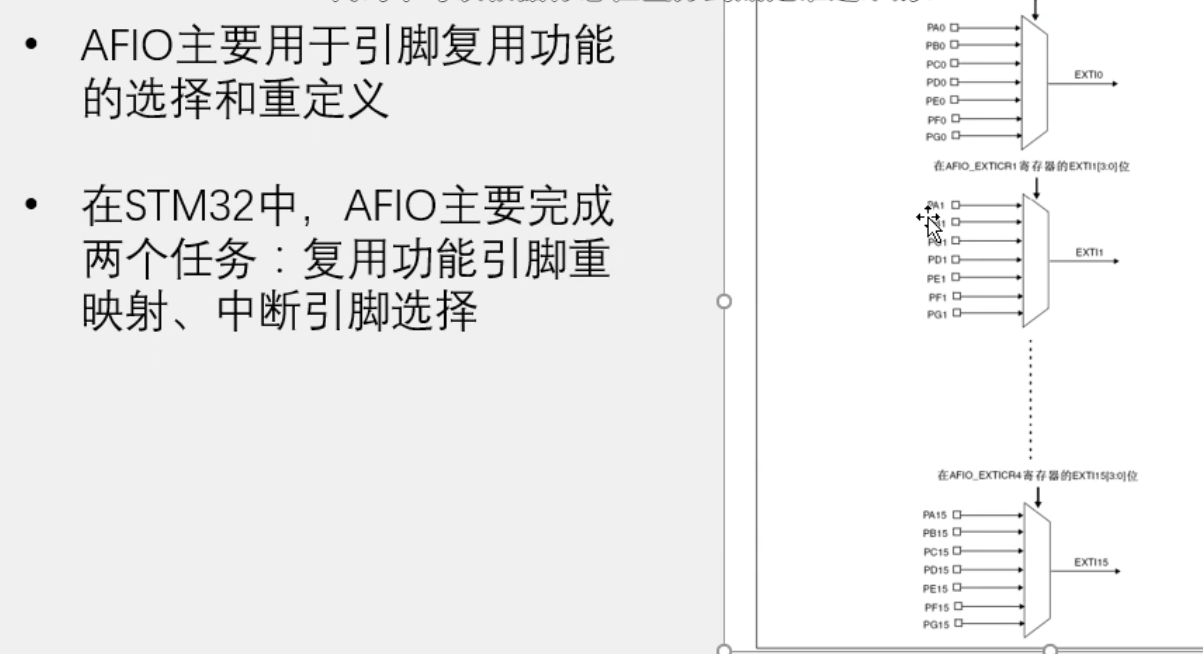 在STM32F103中,主要由AFIO管理EXTI的引脚映射。它决定了是PA0、PB0还是PC0等连接到EXTI0这条线上。