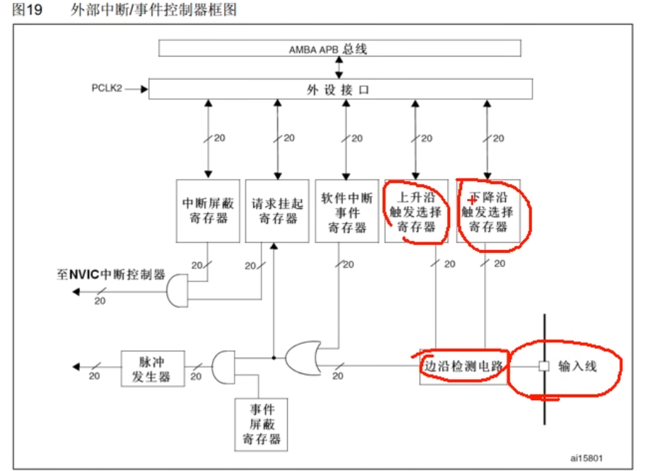 最多20个中断/事件线:EXTI有20条独立的“通道”,编号为0~19。