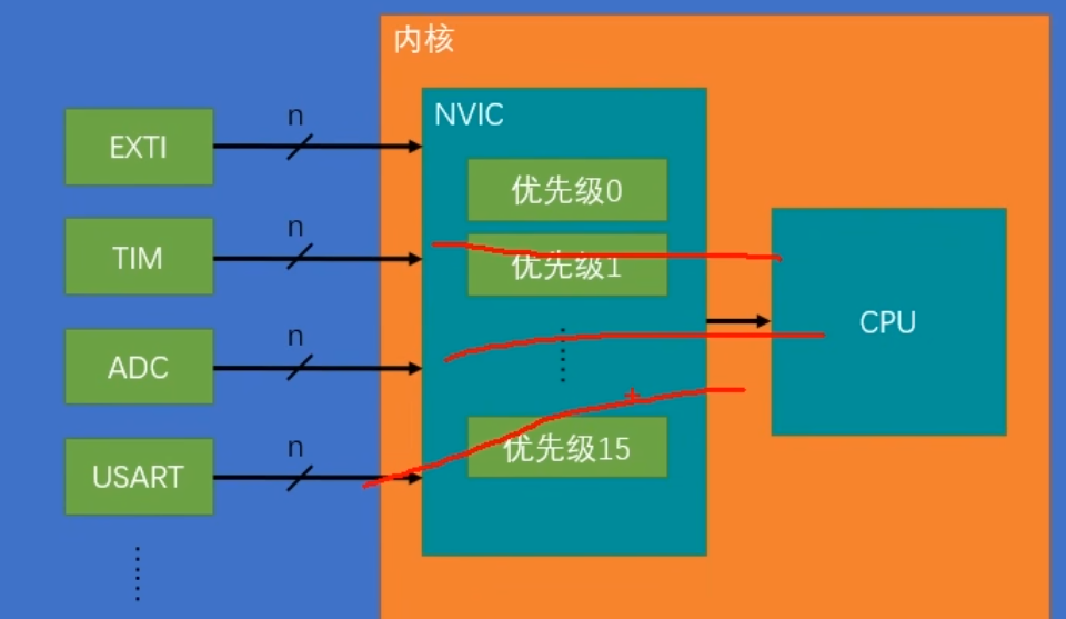 NVIC:是“总指挥部”,负责管理所有中断源的优先级,并最终决定是否、以及何时将中断请求传递给CPU。即使EXTI发出了请求,如果NVIC中没有使能该中断,CPU也不会响应