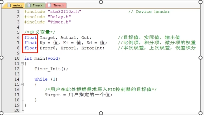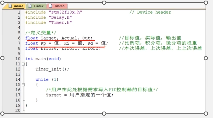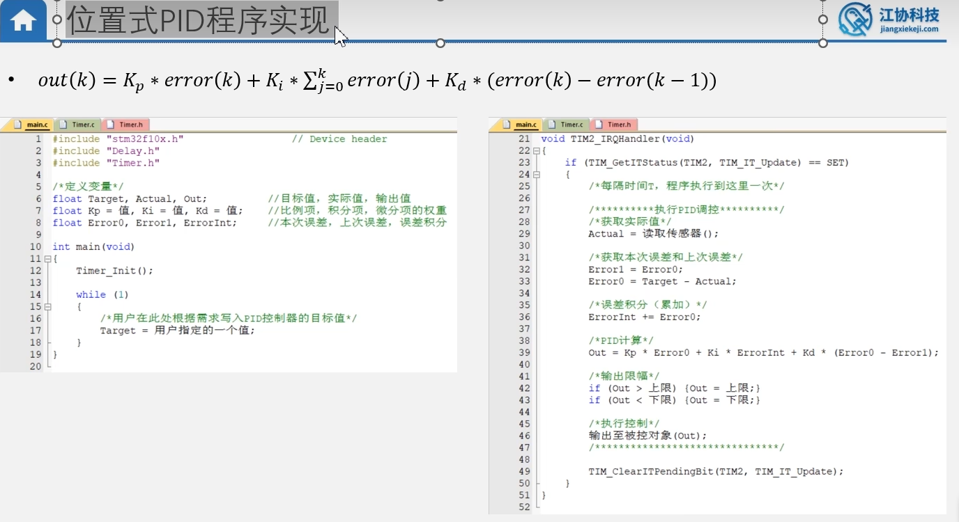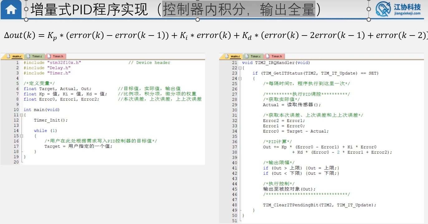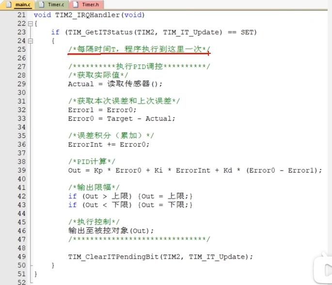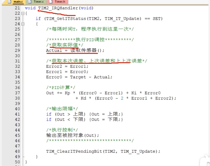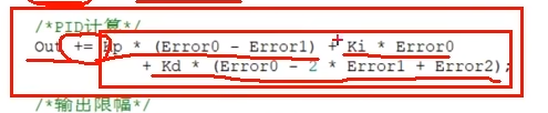 然后定时中断里面是PID控制的核心代码。error1就是上次误差,error0就是本次误差=目标值-实际值。因为把误差存在error1里面后,第二次来的话error1里面存放的就是上一次误差,error0存放的是本次误差。