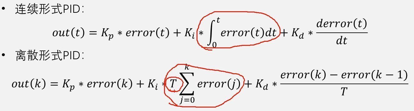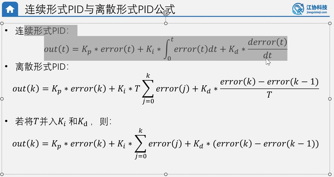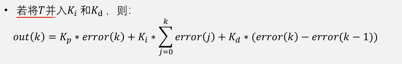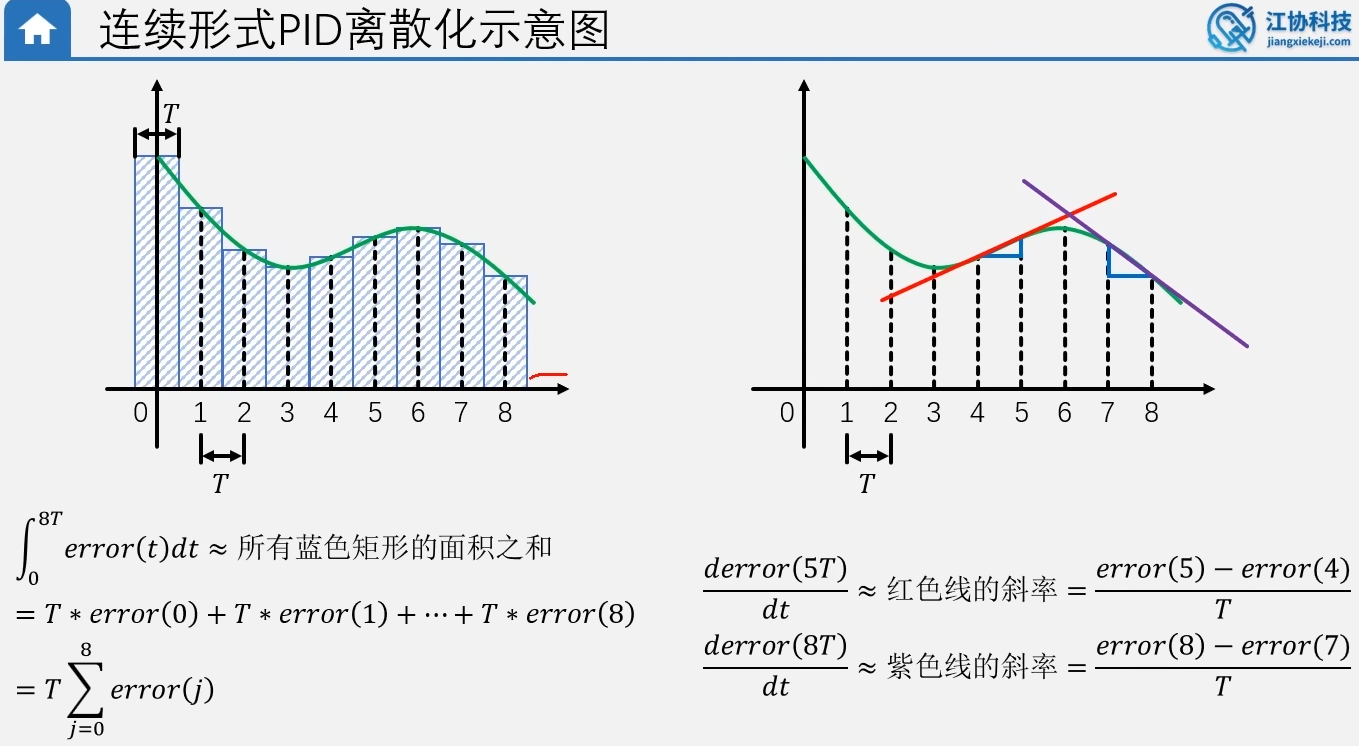 离散形式的公式就是:k的取值是0,1,2等等表示的是第几次调控,error(k)的意思就是第几次调控时当前的误差值。T是离散后的调控周期,也就是系统每隔T时间,调控一次。