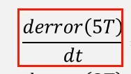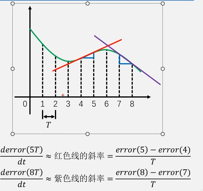 就是求T=5时刻的微分,也就是k=5时刻,绿线切线的斜率,只是绿色斜率在离散的情况下,我们需要借助上一次的误差值近似求,也就是在error5和error4之间连接一条线,这里用红线表示,这个红线近似为k=5时刻的切线。且T越小这个时刻越精确,和上面的T一个道理。斜率就是dx/dy,这里dx就是error5减error4,dx就是T,因此error5减error4再除以T=斜率如果大于的话斜率就是正的就是红色线,负值的话斜率就是负的,紫色线。