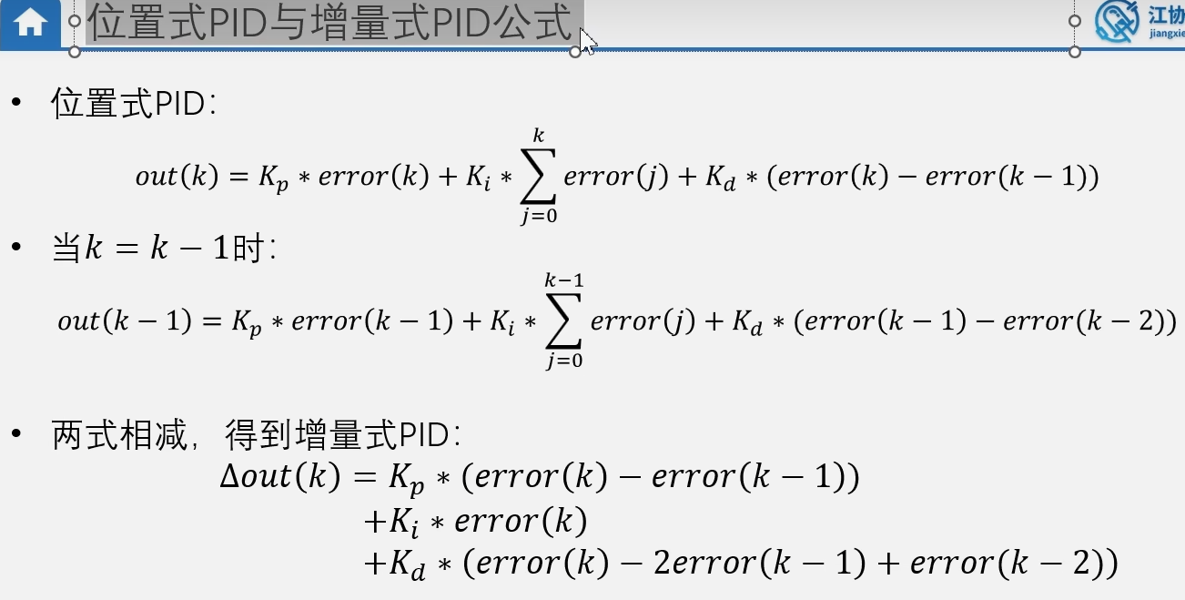 第三条的意思就是可以再控制器里定义一个变量out,每次计算的到增量后,执行out+=三角out。将三角out累加到out变量上这样这个out变量就是全量输出。之后out变量就可以作为调控力度,输出给执行机构了。我们这样处理后增量式PID与位置式PID整体功能没有区别,因为他们现在输出的都是全量的输出值。