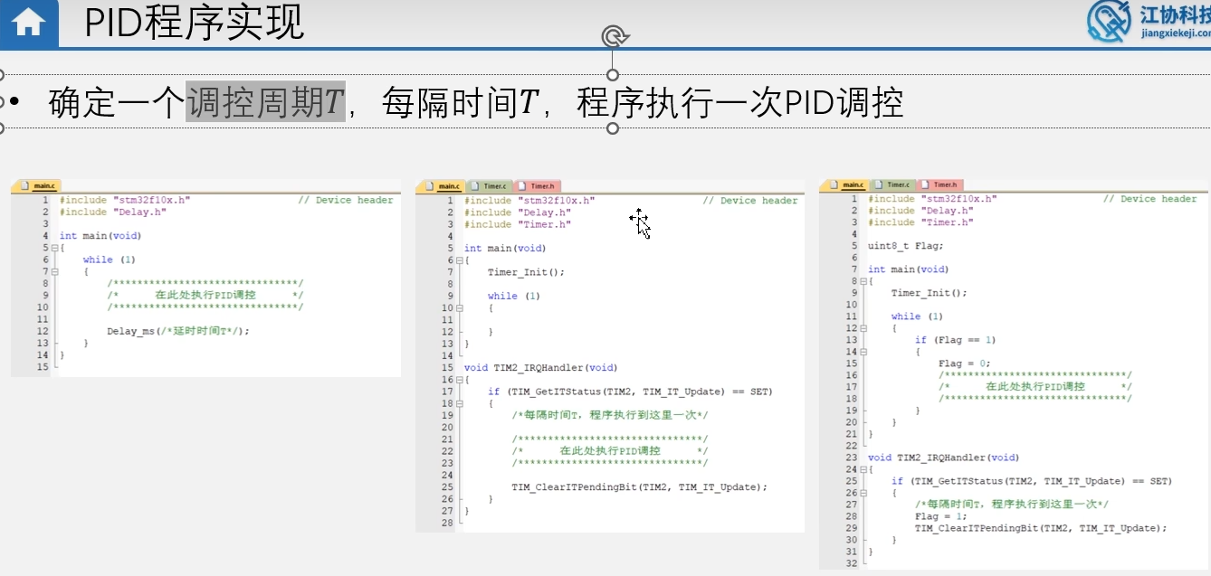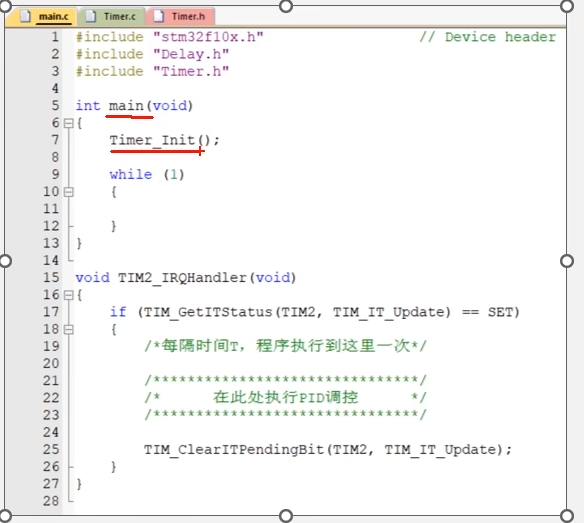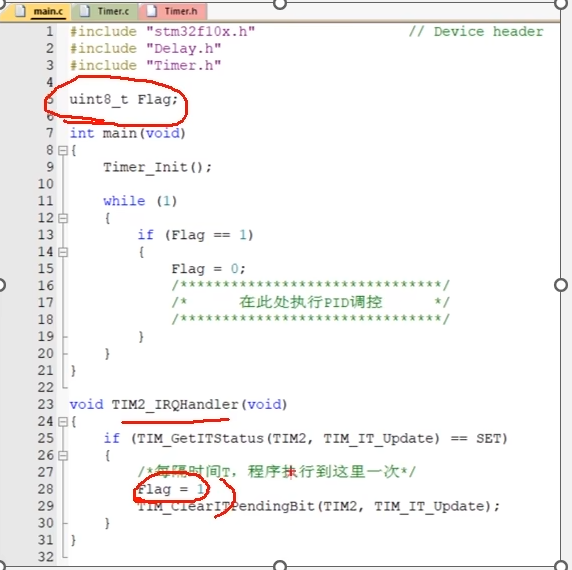 稍微完善一点,这既是我们项目中用到的。可以防止硬件层次的冲突。但是也有个弊端,因为我们把程序写在主程序里面,所以我们的主程序要是堵塞的话,就会PID调控不及时,一定要防止主程序堵塞。