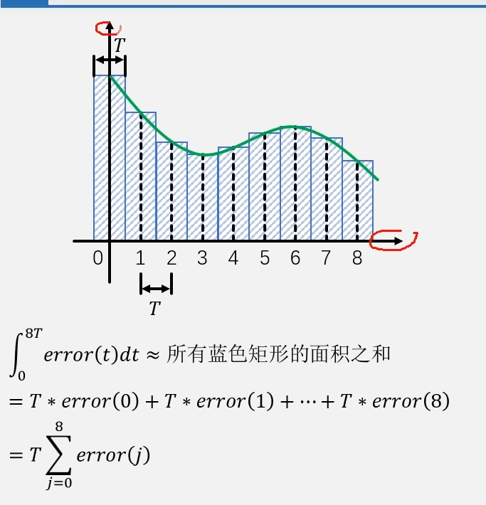 这个是积分示意图,横轴表示时间,纵轴表示误差的变化。绿色线是连续形式下的误差曲线。然后横轴每个数字表示第K次调控。其中每次调控的时间间隔都是T,T就是调控周期。