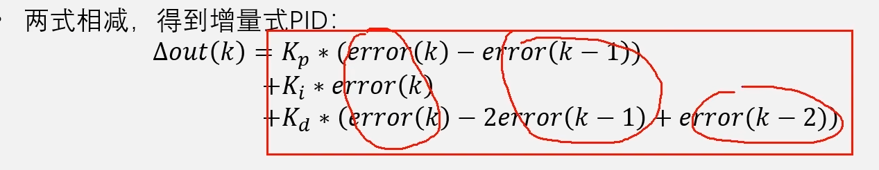 之后观察增量式PID计算公式。我们可以发现等号右边没有任何求和符号,全是最基础的加减乘除计算过程,非常清晰。并且其中只出现了error(k),error(k-1),error(k-2)这三个输入变量。因此我们可以有一个结论,增量式PID输出的结果三角out,只是本次,上次,上上次,这三次error的线性组合。