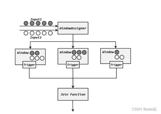 join时数据先按照key进行分组、进入对应的窗口存储,当窗口结束时,算子会先统计出窗口内两条流的数据所有组合,即做一个笛卡尔积;然后进行遍历传入joinfunction的join方法中