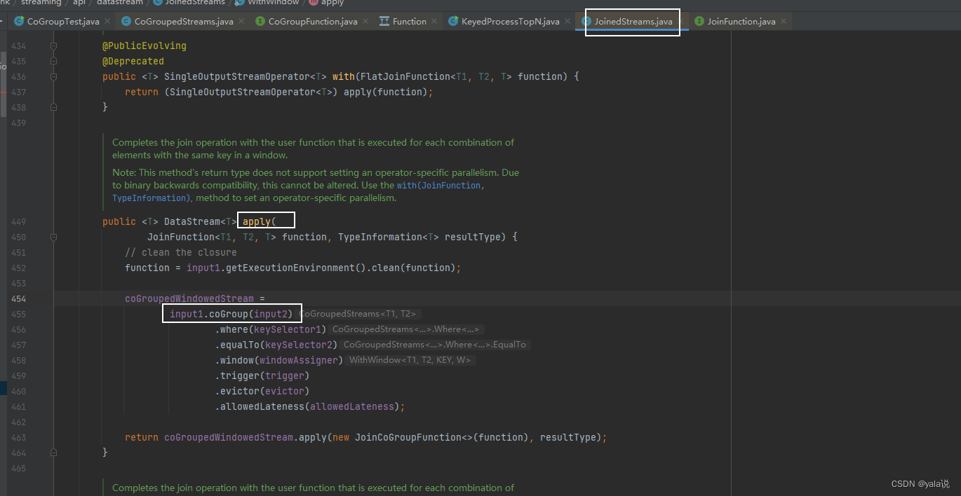 where()和 equalTo()方法制定两条流中连接的key;然后通过window()开窗口,并调用apply()传入自连接窗口函数进行计算,