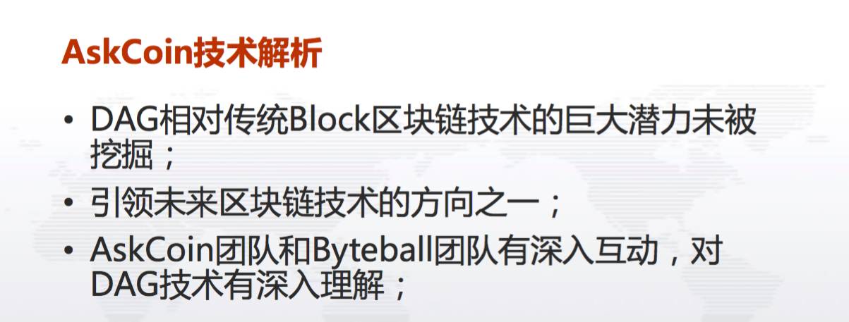AskCoin完全由公司的技术团队自己搭建,代码开源,有着自身的技术优势。AskCoin所用的DAG技术,目前来说还是比较新颖,富有创造力和挑战力的。DAG代表有向无环图,相对传统的区块链技术,在扩展性上具有天然优势,这就意味着整个底层链的TPS可以做得非常高。但是DAG会有一定的劣势,对顺序有要求的场景是有障碍的,比如双花问题。为了解决这一问题,AskCoin会通过Askcoin Hub的主链选择算法来保证Main Chain的稳定性,从而解决双花问题。