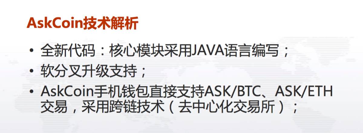 测试钱包会于今年11月份发布,2018年2月主网上线,手机APP钱包也会发布,可以兑换正式的ASK代币。另外Askcoin钱包采用跨链技术直接支持ASK/BTC、ASK/ETH兑换,实现去中心化交易所的功能。