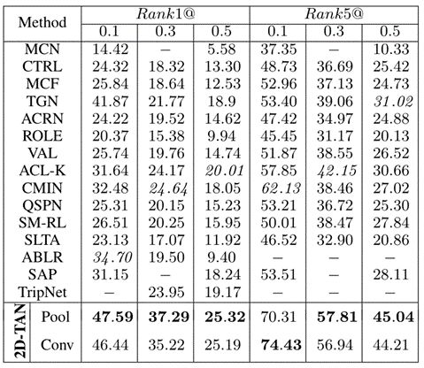 表1:Charades-STA 的实验结果。Pool 和 Conv 表示两种不同的片段特征提取方式,下表同。
