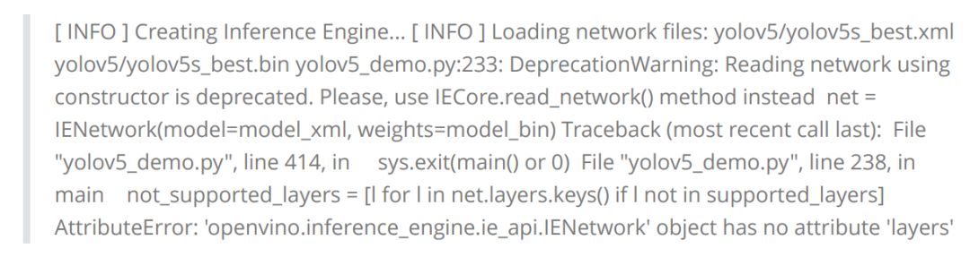 但在实际测试中,会出现:'openvino.inference_engine.ie_api.IENetwork' object has no attribute 'layers' 问题:
