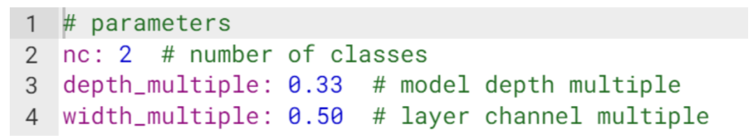 这里使用YOLOv5s进行训练,所以需要同步修改yolov5/models/yolov5s.yaml 文件中的nc数值,设置为2: