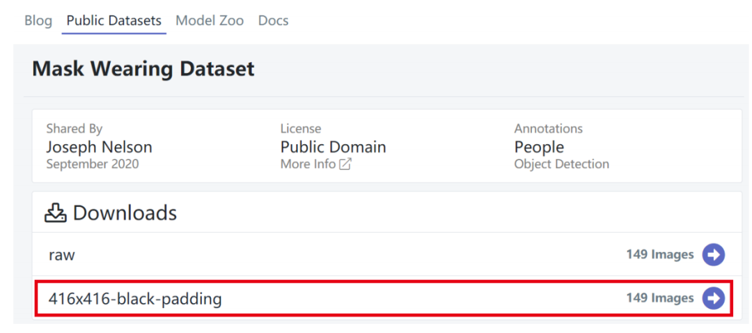 这里我们下载使用roboflow开源的口罩检测数据集(Mask Wearing Dataset):https://public.roboflow.com/object-detection/mask-wearing,该数据集只有149幅图像,方便练手,而且格式直接支持 YOLOv5!