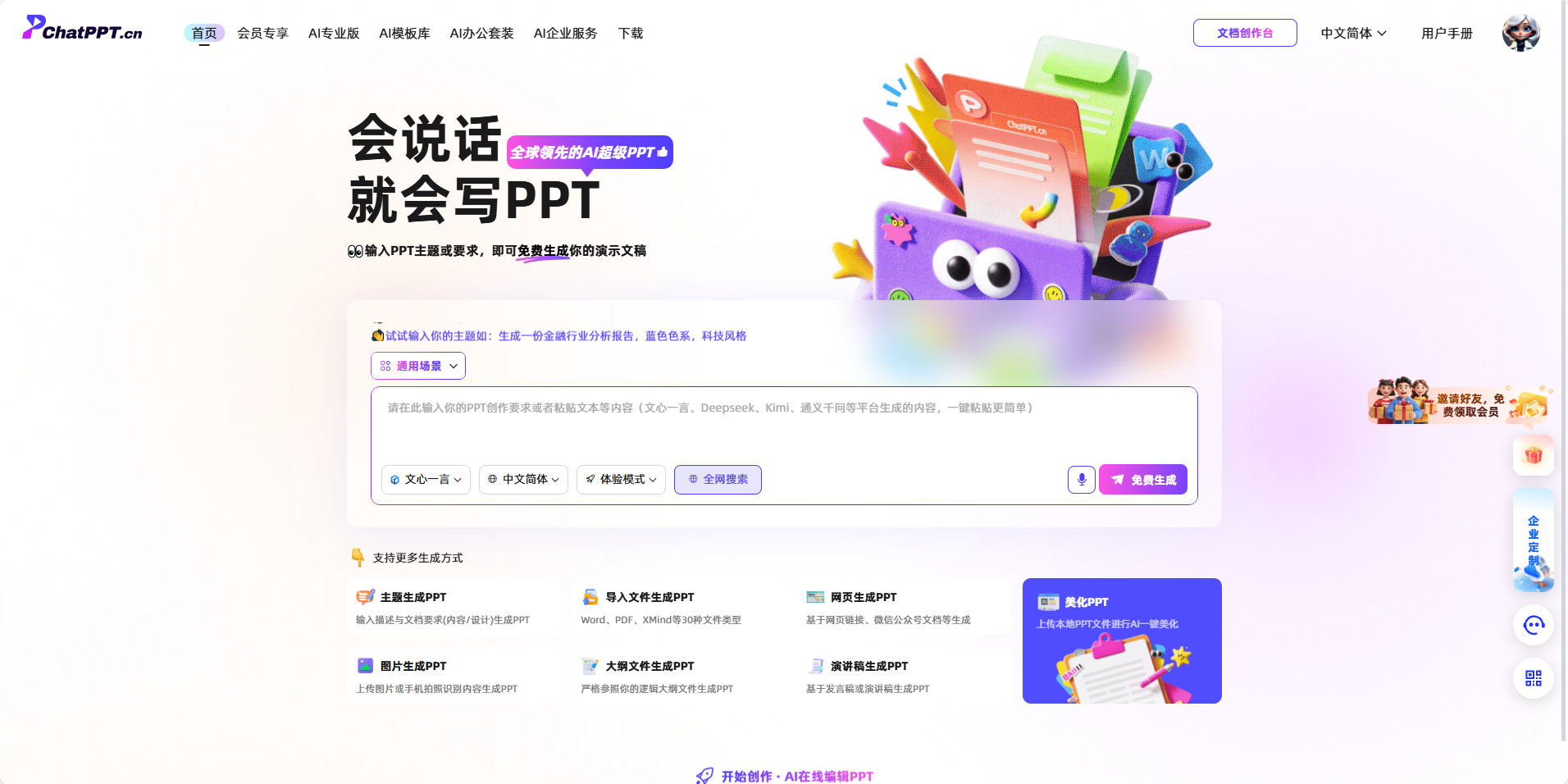 | 讯飞智文 | 内容质量高、语音输入、润色强 | 模板少(仅 20 种),美化能力弱 | ChatPPT 模板多、美化强、交互更灵活 |