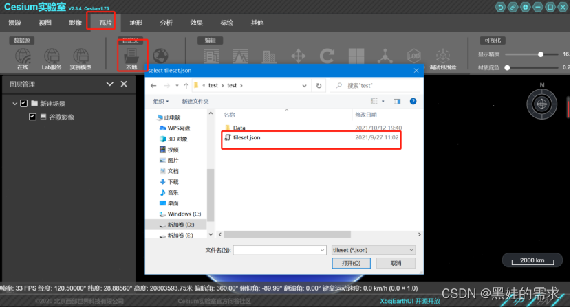 然后选择瓦片-》本地,弹出窗口如下图所示,选择你将要打开的3dtiles文件头,tileset.json