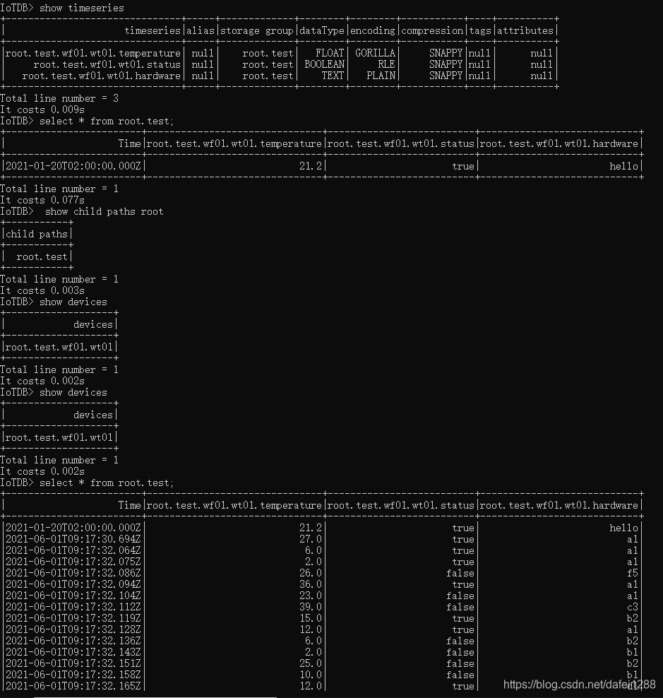 select * from root.test;IoTDB> select * from root.test; +------------------------+-------------------------------+--------------------------+----------------------------+ | Time|root.test.wf01.wt01.temperature|root.test.wf01.wt01.status|root.test.wf01.wt01.hardware| +------------------------+-------------------------------+--------------------------+----------------------------+ |2021-01-20T02:00:00.000Z| 21.2| true| hello| +------------------------+-------------------------------+--------------------------+----------------------------+ Total line number = 1 It costs 0.077s -