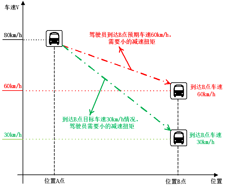 先看下面的图片,车辆从位置A点减速至位置B点,不同的的路况(如红色路况到达B点时,前方车辆车速60km/h;绿色路况到达B点时,前方车辆车速30km/h),会引起驾驶员对到达B点的预期车速不同,这就需要车辆具有不同的减速度。