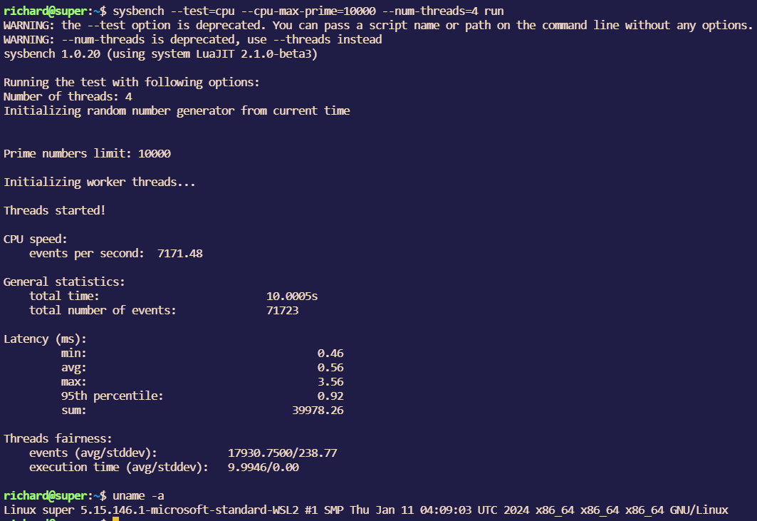 命令为:sysbench --test=cpu --cpu-max-prime=10000 --num-threads=4 run