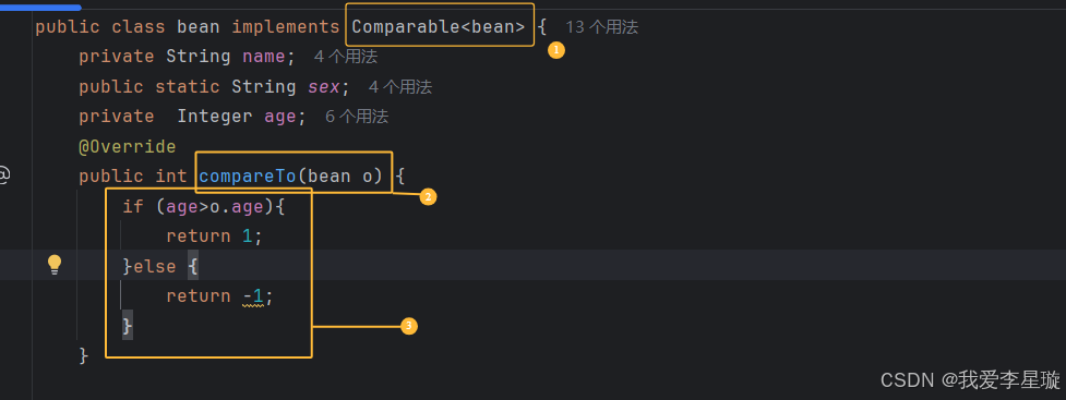 Comparable排序和Comparator排序介绍 Comparator是建立一个新的类,这个类继承Comparator类专门用来完成排序功能,由于比较是两两比较,所以这个类的调用要在集合的参数中 ,这样这个集合就拥有了排序功能。1,在Javabean类中继承Comparable接口,这样就能调用该方法怕排序。Comparable是在JavaBean中继承的接口,该接口可以实现排序功能;2,bean表示该数据类型,o表示传入对象,用以和当前对象作比较。3,两个年龄作比较,返回正数是放在前面,返回负数是放在后面。这样这个新建的类就拥有排序的功能。