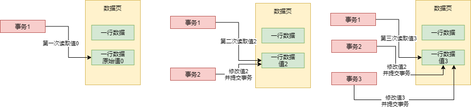 如果事务2在事务1提交之前,是读不到事务1修改的值,必须要等事务1提交之后,才能读到事务1修改的值也就是1,那么这就解决了脏读的问题,但是这又会带来一个问题:不可重复读,假设事务1现在开启事务,第一次读取到的数据就是0,此时事务2将值修改为2,并提交事务,这时事务1第二次读取到值2,此时事务3将值改成3,并提交事务,那么事务1再次读取到的值是3,这就是不可重复读的问题。