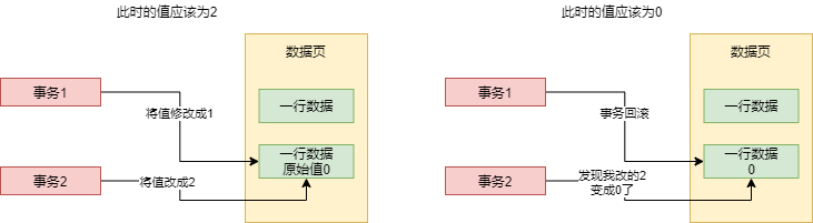 脏写和脏读都是在多个事务同时修改或读取同一行数据的情况下产生的问题。比如现在有事务1和事务2同时对一行数据进行修改,事务1将值改成1,而事务2将值改成了2,这时的值应该是2,但是就在这时,事务1发生了回滚,通过undo log,事务1将值回滚到原来的值0,而此时事务2一看我更新的2怎么突然变成0了,这就是脏写。