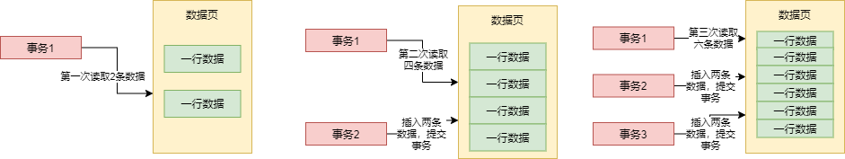其实幻读也很简单,比如事务1执行一条sql,"select * from user where id>5",结果出现了2条数据,此时事务2新插入2条数据,并且提交事务,此时事务1又执行了"select * from user where id>5",结果出现了四条数据,此时事务3也插入了两条数据,并提交了事务,事务1又执行了"select * from user where id>5",结果出现了六条数据。每次执行相同的sql,结果的数量是不一样的,这就是幻读。