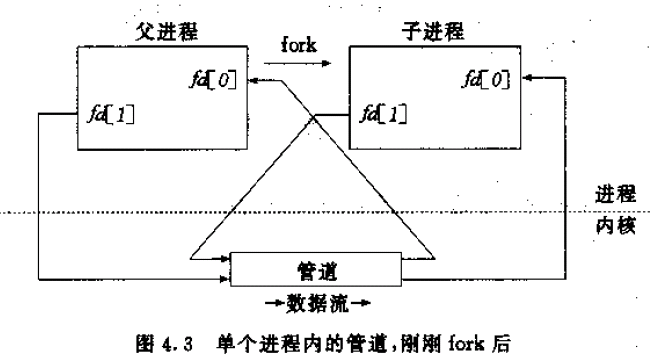 管道的典型用途是以下述方式为两个不同进程(一个是父进程,一个是子进程)提供进程间通信的手段。首先,由一个进程(它将成为父进程)创建一个管道后调用fork派生一个自身的副本,如图4-3所示:
