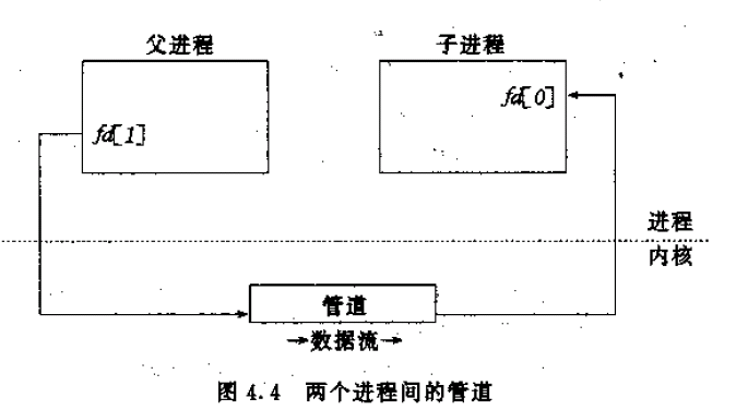 接着,父进程关闭这个管道的读出端,子进程关闭同一管道的写入端。这就在父子进程间提供了一个单向数据流,如图4-4所示: