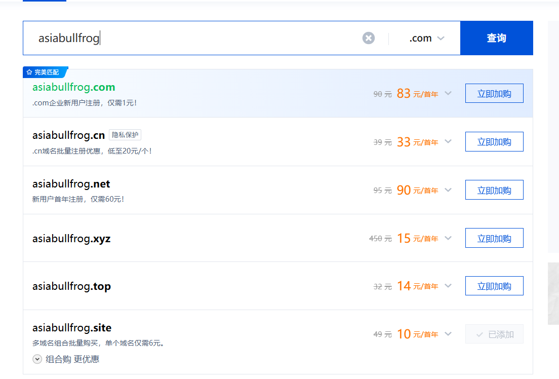 其中完美匹配的意思是与我们想要的域名一模一样匹配的意思,因为在设置域名的过程中,会出现冲突的问题,如你和我同时想要一个域名,就会出现重复,那么系统可能会进行方案提示,如在你想要的一级域名之后添加数字等避免查重(类似于我们注册游戏,昵称后面加上数字避免用户名重复“非常美丽的巨兔12138”),我们可以进行随意选择去购买想要的域名(看好价格,因为有的域名续费价格会比首年开通要贵,如果你打算长期使用的话)。