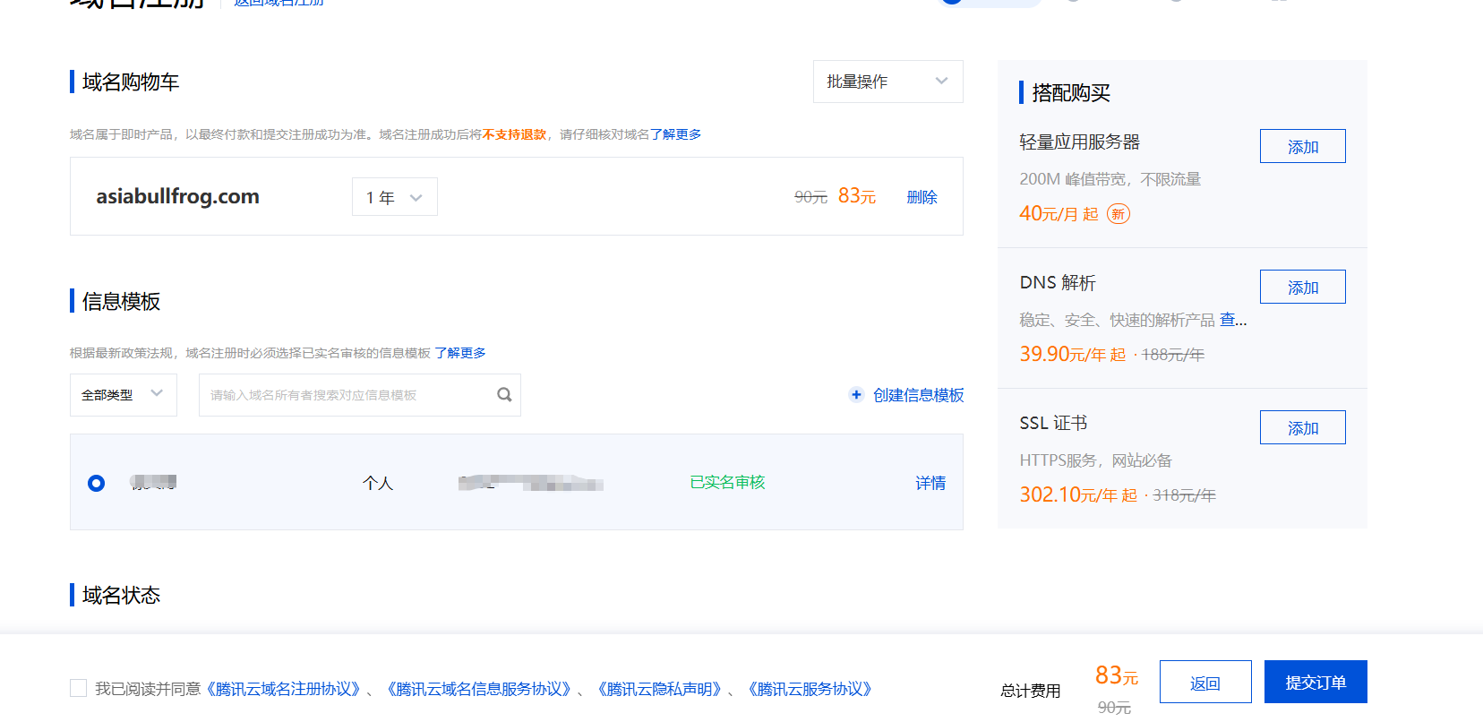 首先要购买一个域名(这里运营商不做推荐,拿腾讯云举例),进入域名注册官网