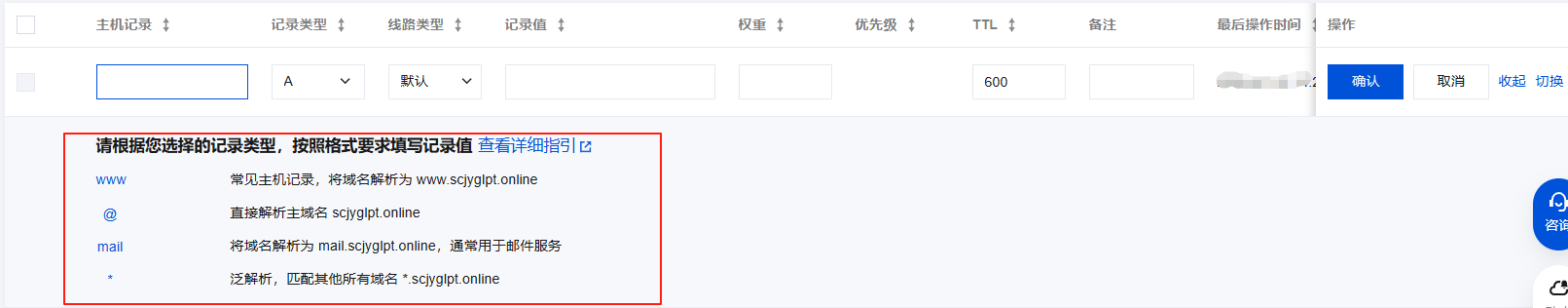 在配置域名解析的页面中有如下图所示的几个填空,其中主机记录可以填写@,www等字样,其中的含义为如果选择了www,那么我们的网址二级域名就是www(访问网站时需要是www.我们买的域名.com,等于我们的云服务器ip192.168.1.1),其中@表示三级域名为空(我们买的域名.com,等于我们的云服务器ip地址 192.168.1.1),我们还可以选填或手动填写其他二级域名,不做过多解释。