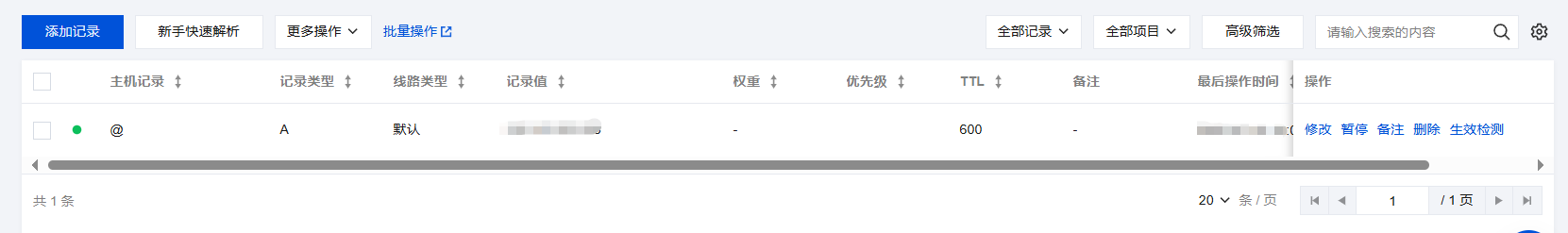 其中记录值的意思就是我们云服务器的ip地址,切记不要加上程序的端口号,这里先不涉及到端口号,其他都默认就ok了,权重可以不写,点击确认。