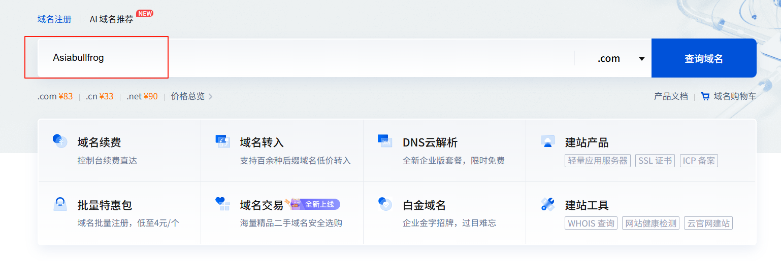 但是传统ip地址造成的数字网址不容易记忆,且没有独特性(方便人记忆的网址有特殊意义),如我想要网址变为http://www.AsiaBullfrog.com(亚洲牛蛙英文),且访问这个地址等同访问了我的192.168.1.1:8080网址进入我的网站,其中我们将上述举例网址拆开解析,.com为顶级域名,Asiabullfrog为一级域名,www则为二级域名,其中顶级域名是固定的(一共就那么多,想要什么只能通过点选的方式),二级域名为我们想要的英文特殊含义字母组成(随意编写),三级域名为后期配置域名解析时规定(后续讲解)
