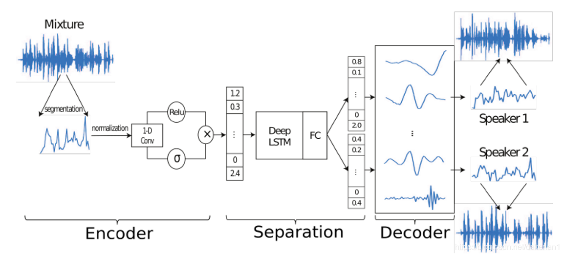 核心工作:提出使用时域音频分离网络,即编码器-解码器框架直接在时域对信号建模,并在非负编码器输出上执行声源分离。