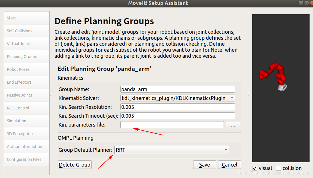 在Planning Groups选项中,Kin.parameters file空着,group default planner选择RRT