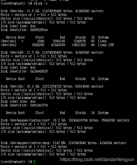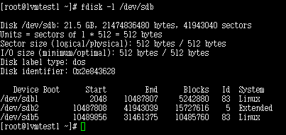 可以看到有三个硬盘(使用的VMware Workstations创建的虚拟机),第一块硬盘 /dev/sda 是创建系统时自动划分的。/dev/sdb /dev/sdc是后来新增的两块硬盘。其中/dev/sdb 已经做了分区,一块主分区,一块扩展分区,扩展分区上又创建了一个逻辑分区。/dev/sdc 未创建分区。