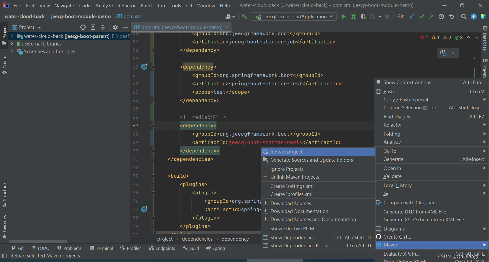单击鼠标右键,选择Maven->Reload project,重新加载项目,如下图所示: