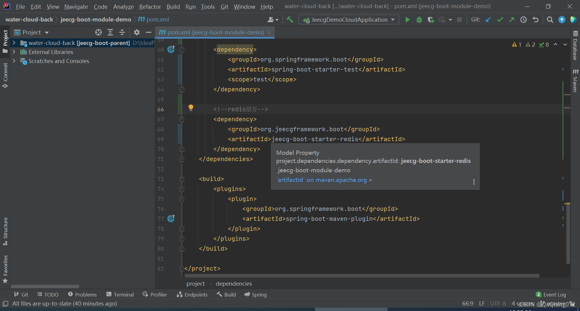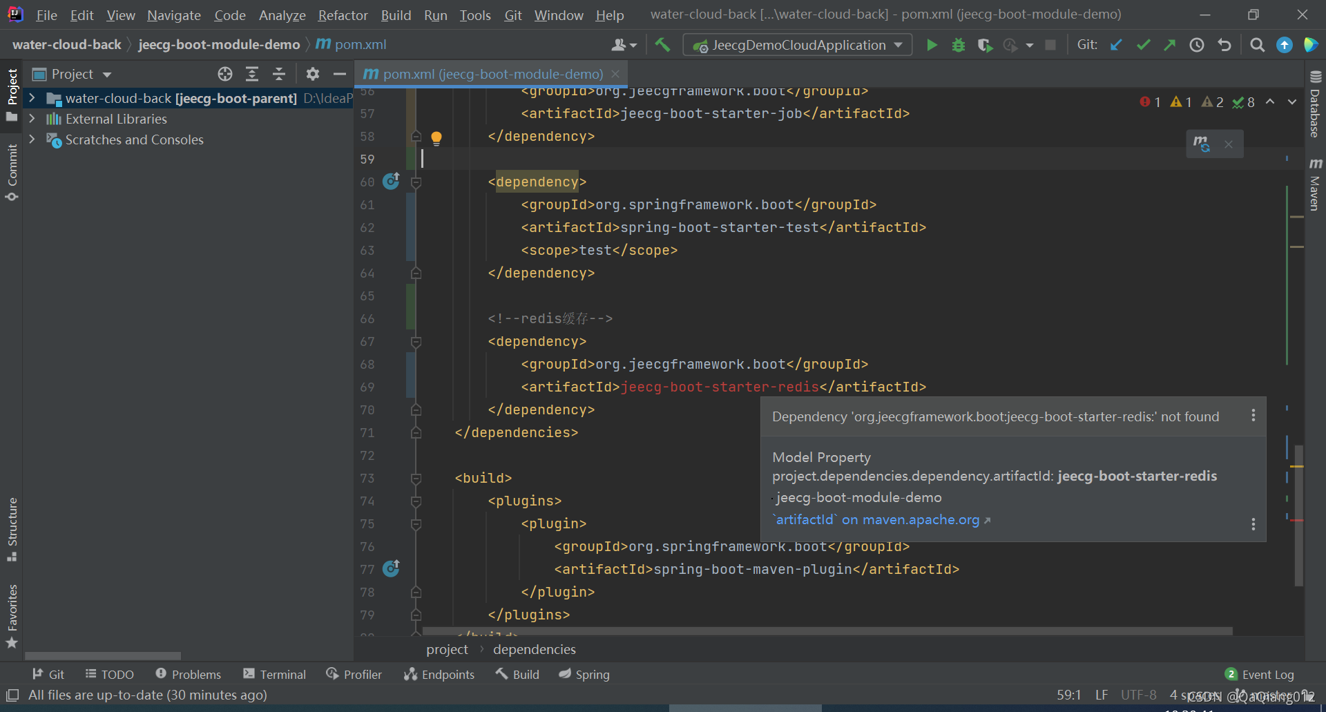 使用Redis缓存集成2.4+,引入Redis缓存jar包后报“Dependency 'org.jeecgframework.boot:jeecg-boot-starter-redis:' not found ”错误,如下图所示: