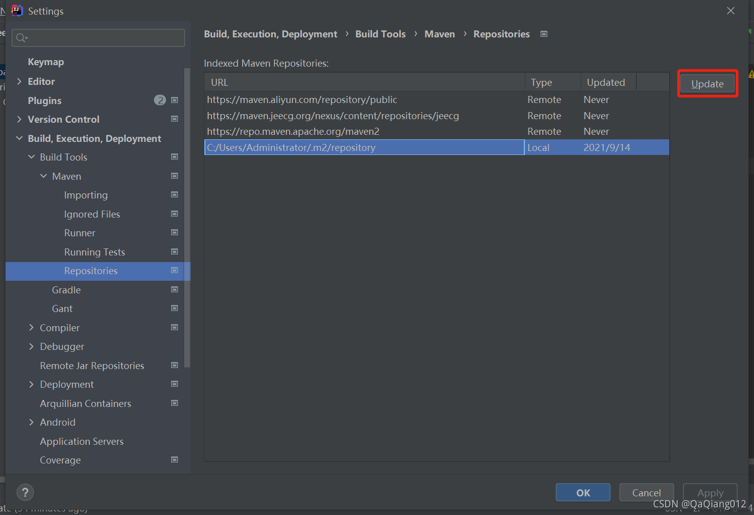 打开Settings->Build,Execution,Deployment->Build Tools->Maven,选中本地仓库,例如“C:/Users/Adminstrator/.m2/repository”,单击右侧“Update”按钮,更新本地仓库,如下图所示: